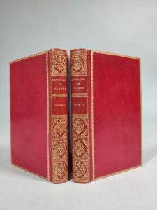 PLATON. La République, ou Dialogue sur la Justice. Paris, Brocas & Humblot, 1762 ; 2 volumes in-12, basane maroquinée rouge ancienne, festons dorés sur les plats, dos lisses très ornés de motifs dorés, tranches dorées. Une préface de 100 pages n'est pas signée. - Jolies reliures.