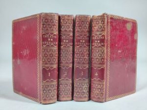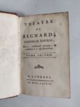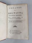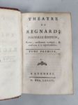 REGNARD Jean-François. Théâtre. Londres, 1784 ; 4 volumes in-16, maroquin à long grain rouge de l'époque, petite dentelle, dos lisses ornés de motifs dorés, tranches dorées, petit manque avec une coiffe.