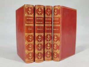 SCARRON Paul. Roman comique. Londres (Paris ?), 1781 ; 4 volumes in-16, basane maroquinée rouge ancienne, dos lisses ornés de motifs dorés, tranches dorées.— Jolies reliures.