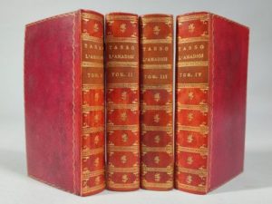 TASSO Bernardo. L'Amadigi. Bergame, P. Lancellotti, vers 1755 ; 4 volumes in-12, maroquin rouge ancien, filet doré, dos lisses ornés de motifs dorés (légèrement éclaircis), tranches dorées.