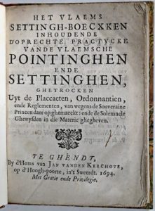 (Flandres, Droit) - [STALINS, Jacques J.-B.].- Het Vlaems settingh-boecxken inhoudende d'oprechte practycke vande Vlaemsche pointinghen ende settinghen [...]. Ghendt [Gent], d'Hoirs van Jan vanden Kerchove, 1694. In-4° : [10]-81-[5 (op 9)] pp. (4...