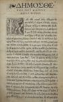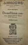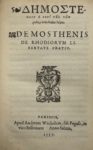DÉMOSTHÈNE — Κατά Φιλίππου. Contra Philippum oratio prima. Ejusdem de pace. Paris, Chrétien Wechel, 1546. – Ὁ περί τῆς των Ῥοδίων ἐλευθερίας λόγος. De Rhodiorum libertate oratio. Paris, André Wechel, 1557. – Ὁ πρὸς τὸν Λεπτίνην λόγος. Oratio ad Leptinem. Paris, Chrétien Wechel, 1532. – Ὁ κατὰ Ἀριστοκράτους λόγος. Contra Aristocratem oratio.