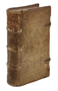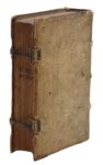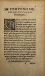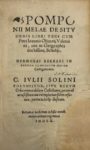 Cologne, Johann Gymnich, 1544. 2 ouvrages en un volume in-8, peau de truie sur ais de bois, roulette, fleurons et filets estampés à froid sur les plats, dos à trois nerfs, fermoirs métalliques, titre manuscrit en gouttière (Reliure germanique de l'époque).Édition rare de ce manuel géographique publiée avec les notes de Pedro Juan Olivar et les corrections d'Hermolao Barbaro. Elle comprend à la suite l'encyclopédie de Solin intitulée Polyhistor.