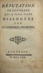 On joint : [MORELLET (André)]. Réfutation de l'ouvrage qui a pour titre Dialogues sur le commerce des bleds. Londres [Paris], s.n., 1770. In-8, basane racinée, dos lisse orné, tranches rouges (Reliure de l'époque). Édition originale rare. Cette réfutation par l'abbé Morellet, du point de vue de l’orthodoxie physiocratique, du grand ouvrage de l'abbé Galiani contre la libéralisation du commerce du grain, était imprimée dès le mois d'avril 1770, mais elle fut d'abord interdite et ne parut que quatre ans plus tard, avec un carton comportant un Nouvel avertissement daté de novembre 1774.