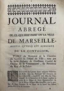 [PESTE DE MARSEILLE]. – [PICHATTY DE CROISSAINTE] — Journal abrégé de ce qui s'est passé en la ville de Marseille, depuis qu'elle est affligée de la contagion.