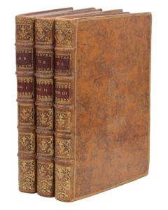 1760. 3 volumes in-4, veau marbré, triple filet doré, dos orné, tranches marbrées (Reliure de l'époque).La plus belle édition de Racine publiée au xviiie siècle.