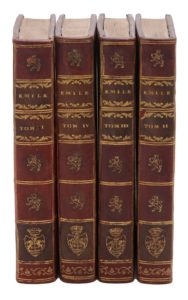 1762. 4 volumes in-12, maroquin rouge, triple filet doré, dos lisse orné de pièces d'armes répétées, pièces de titre et de tomaison de maroquin brun, armoiries dorées en queue sur une pièce de maroquin brun, dentelle intérieure, tranches dorées (Reliure de l'époque).Édition parisienne à la date de l'originale de cette œuvre majeure dans laquelle Rousseau expose les principes d'une éducation naturelle. Les fautes listées dans l'errata sont corrigées dans le texte.