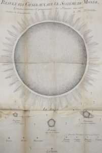 La partie cosmographique se compose d'un Précis d'astronomie suivant M. l'abbé Dicquemare, d'un Autre extrait d'après la Cosmographie de M. Mentelle, des Tables des équations du Soleil d'après l'abbé Dicquemare, ainsi que deux grandes planches repliées, soigneusement dessinées à la plume ; l'une représente le Soleil et les planètes du système solaire (Résultats généraux sur le système du monde suivant la Cosmographie de M. Mentelle), et l'autre, l'orbite de la Terre (Notion approximative du mouvement de la Terre dans son orbite autour du Soleil).