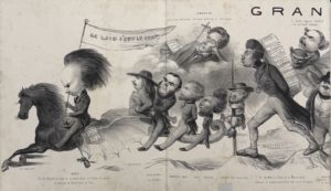 Paris, Aubert, s.d. [vers 1842]. Ensemble deux panoramas lithographiés en noir (environ 139 x 27 cm) repliés en 2 volumes in-4, demi-cuir de Russie vert, titre en lettres gothiques dorées au premier plat, dos lisse muet (Reliure de l'éditeur).Premier tirage de ces deux rares panoramas lithographiés, à l'adresse de l'imprimerie d'Aubert. Le premier caricature les écrivains et poètes romantiques, Hugo chevauchant en tête avec une bannière à la main où est écrit « le laid c’est le beau », suivi de Gautier, Lamartine, Dumas, Balzac, Vigny, etc. Le second panorama est consacré aux comédiens, tels Rachel, Debureau, Frédérick Lemaître, Beauvalet, etc.