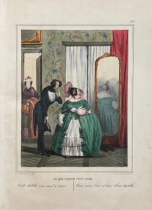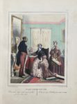 In-4, monté sur onglet, basane maroquinée violette, double encadrement de filets et rinceaux dorés aux angles, titre doré sur le plat supérieur, dos lisse muet, tranches dorées (Reliure de l'époque).Premier tirage de cette suite fort rare, complète des 30 lithographies de Frédéric Bouchot (IFF, n°32), chacune légendée d'un court dialogue soulignant avec humour l'hypocrisie des conventions sociales.