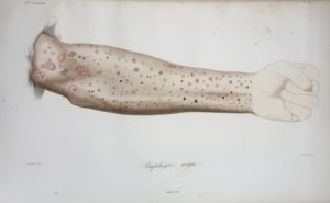Paris, Labé, 1845-1856. Grand in-folio, demi-chagrin grenat avec petits coins de vélin, dos orné de caissons au filet doré (Ateliers Laurenchet).Édition originale de ce magnifique atlas dermatologique comprenant 60 grandes planches en couleurs, très réalistes, gravées d'après Bocourt et Jadin par Choubard, Annedouche, Oudet, Visto, Coupé, Viscot, et coloriées au pinceau par Gérard.
