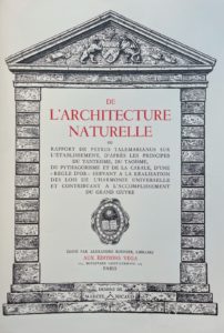 TALEMARIANUS (Petrus) — De l'architecture naturelle, ou rapport sur l'établissement, d'après les principes du tantrisme, du taoïsme, du pythagorisme et de la cabale, d'une règle d'or servant à la réalisation des lois de l'harmonie universelle et contribuant à l'accomplissement du Grand Œuvre.