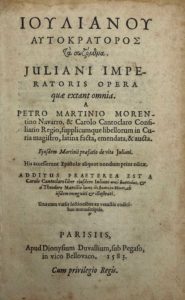 JULIEN L’APOSTAT. Τα σωζόμενα. Opera quæ extant omnia. Paris, Denis Duval, 1583. 4 parties en un vol. in-8, vélin rigide à recouvrements du XVIIe siècle. Première édition collective des œuvres de l'empereur romain Julien II, dit l'Apostat ou encore le Philosophe, imprimées en grec avec leur traduction latine en regard et des commentaires critiques par Pierre Martini, Charles de Chantecler et Théodore Marcil. Les Épîtres y sont éditées pour la première fois (pp. 146-342). Légères rousseurs.