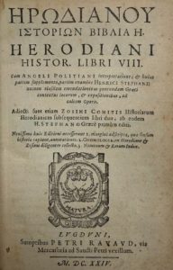 HÉRODIEN. Ιστοριων βιβλια Η. Histor[iarum] libri 8. Lyon, Claude Cayne pour Pierre Ravaud, 1624. In-8, demi-basane sable, dos orné (Reliure moderne). Édition lyonnaise imprimée sur deux colonnes avec le texte grec et sa traduction latine par Ange Politien. Exemplaire court de marges ; rousseurs et taches éparses.