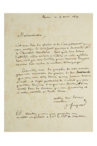 « C'est avec bien de plaisir et de l'empressement que je vous envoye le certificat que vous a demandé Mr le Chevalier MONTALVI. Tant qu'il sera besoin d'attester votre ardeur à l'étude et votre aptitude dans l'art que vous cultivez, je me trouverai toujours heureux d'en rendre le meilleur témoignage ». Il en profite pour la remercier des preuves de bon souvenir qu'elle a données à sa femme comme à lui, et l'assure de « l'intérêt que nous prendrons toujours à ce qui vous touche, à vos succès dans la carrière que vous poursuivez et à votre réussite en toute chose »...