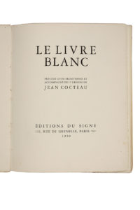 COCTEAU (Jean). — Le livre blanc. — Paris, Éditions du Signe, 1930. — In-4, 69 p., [2] f. dont un fac-similé, [3] f. ( justif., ach. d'imprimer, 1 blanc), fr., pl., broché, couverture blanche rempliée (fentes au dos., bruniss. sur une...