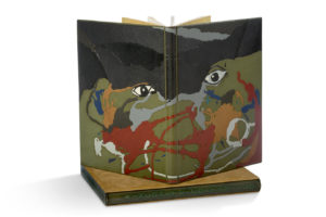 couvrant le dos et les plats, composé de pièces de cuirs de textures variées, et où l'on peut distinguer un visage, doublures et garde de daim sable, tête dorée, non rogné, chemise souple en chagrin vert titrée au dos, étui daim et chagrin vert assorti [Gomez] (dos de la chemise bruni, petits accrocs au bord de l'étui).