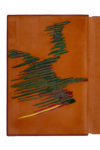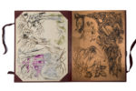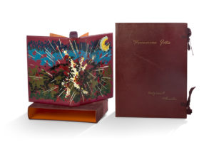 d'une riche composition multicolore mosaïquée, avec un personnage central et la lune en haut à droite, doublures et gardes de daim orangé, chaque contreplat décoré d'un personnage courant de profil mosaïqué, tête dorée, non rogné, couv. sup. conservée, chemise de daim marron portant au dos le titre mosaïqué, et au plat sup. le nom de l'auteur mosaïqué, étui assorti ; portefeuille de maroquin havane à lacets, portant le titre et la mention « original plancha » mosaïqués au plat sup. [Gomez] (lég. griffures superficielles sur le portefeuille).
