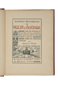 ORAZI. PARIS (Gaston). — Aventures merveilleuses de Huon de Bordeaux, pair de France, et de la belle Esclarmonde, ainsi que du petit roi de féerie Auberon. — Mises en nouveau langage par Gaston Paris. Paris, Didot, [v. 1898].— In-4, VIII-315...