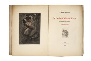 RASSENFOSSE. — BARBEY D'AUREVILLY (Jules). — Le bonheur dans le crime. — Paris, “La Connaissance”, 1920. — 1 vol in-4, [2] f. (fx. titre, titre), 68 p., broché, couverture imprimée en noir et rouge avec un portrait gravé (couverture...