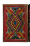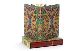 riche décor géométrique mosaïqué composé de pièces multicolores de maroquin séparées de filets dorés, sur le dos et les plats, doublures de maroquin rouge ornées de composition de pièces mosaïquées, différente de celle des plats, bordée d'un listel de maroquin brun, de filets et d'une roulette dorée, roulette dorée aux coupes, non rogné, chemise demi-maroquin à recouvrements, étui [A. Palomino Olalla] (infime frott. au dos de la chemise).