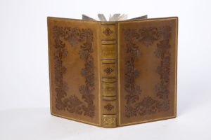dorés et à froid, plats bordés d'un listel et d'un filet dorés et orné d'une grande plaque rocaille à froid, double filet doré aux coupes, roulette intérieure, tranches dorées (qq. frott. aux coins et coupes, fente réparée en queue d'un mors sur 2 cm., rouss. éparses modérées).