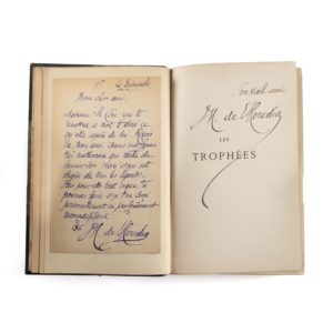 l'auteur sur chine, dont un avec sa signature autographe au crayon bleu. Envoi a. s. (nom du destinataire effacé). On a joint une LAS de Hérédia, recommandant une amie. Petits frottements, 2 mors fendus.