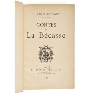 MAUPASSANT (Guy de). Contes De La Bécasse. Paris, Rouveyre, 1883. In-12, demi-basane verte de l'époque, dos lisse orné, sans la couverture (Rel. ép.). Édition originale, dont il n'y eut pas de grands papiers. Dos passé, infimes...