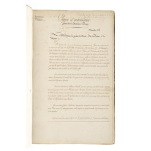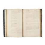 déclassé puis acquis par le propriétaire actuel auprès du Ministère des Armées lors d'une vente en 2017. Copie manuscrite soigneusement calligraphiée en noir et rouge, réunissant des rapports, extraits de discours, lettres, notes, discours, ordonnances, instructions d'intendance militaire… datés décembre 1816 à juin 1836 ; puis, à partir du f. 122, une autre plume copia des documents datés 1807 à 1839. Ces documents ont été rassemblés pour le général de Cavalerie Claude-Antoine-Philippe de Préval (1776-1853), général sous la Révolution et l'Empire, membre du Ministère de la guerre sous la Monarchie de Juillet, et auteur d'ouvrages militaires réputés. Ce recueil, peut-être destiné à un usage historique et littéraire, concerne la création de nouveaux corps d'intendants militaires (f. 6), l'administration générale du département de la guerre (f. 19 et sq) avec les observations de Préval et du Général Durrieu, un historique des décisions ministérielles depuis 1822 (f. 58 et sq), un projet d'ordonnance sur l'organisation de l'intendance (f. 90 et sq), un extrait d'ordonnances relative au défiler (f. 112 v° et sq)... Cachet répété "Cabinet du Général Préval". Reliure très usagée, charnières fendues, manques au dos.