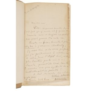 On a joint une belle LAS de l'auteur à son ami l'écrivain Émile Pierre (datée 8 oct. 1886) lui demandant l'autorisation de venir travailler chez lui pour terminer "Axël", afin d'éviter d'être troublé "par les cris de ma smala". Villiers avait préfacé le recueil d'Émile Pierre "Le Rêve d'aimer", et lui dédicaça "Les amants de Tolède" dans Histoires insolites.