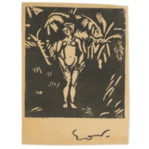 Emile Othon FRIESZ (1879-1949) Femme nue debout sous les palmiers, 1913 Bois gravé sur papier chamois Cachet du monogramme Woodcut engraving on chamois paper, monogram stamp Sujet : 11 X 10, 2 CM ; Feuillet : 14,5 X 11 CM - Image : 4,3 X 4 ; Sheet...