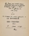 Luc DIETRICH. Le Bonheur des tristes. Paris, Denoël, 1935. In-12, demi-maroquin marron à coins, dos lisse, tête dorée, couverture et dos (Jandel). 282-(2f.) Édition originale. Un des 200 exemplaires sur alfa (n° 125), celui-ci portant un envoi autographe signé sur le faux-titre Pour Jane ; une soirée comme / il se doit quand on éprouve / le besoin d'offrir ce livre. /Avec l'affection de / son ami / Luc / Et l'espoir de venir rejoindre ce / livre / 9 juin 1938 / Paris. Bel exemplaire malgré le dos légèrement passé.