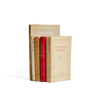 André MALRAUX. La Condition humaine. Paris, NRF, 1933. In-12, broché, chemise et étui. Lh, 389-390 /// 374-(1f.)-375 à 402-(1f.) // 269-(3f.) // 184-(2f.) // 269-(2f.) // 89-(1f.) Édition originale. Un des 100 exemplaires réservés aux Sélections Strasbourgeoises, ici sur vélin pur fil (n° 414). Bel exemplaire presqu'entièrement non coupé. On joint du même auteur en édition originale ou en partie originale, parus à Paris chez Grasset ou à la NRF : - Les Conquérants. Grasset, 1928. In-12, demi-chagrin rouge à coins (Lavaux). Ex. sur alfa. Envoi autographe signé à Monsieur Marcel Blancheteau. - Royaume-Farfelu. NRF, 1928. In-4, broché. Édition en partie originale. 1/572 vélin pur fil (n° 72). Pâles rousseurs à la couverture. - Le Temps du mépris. NRF, 1935. In-12, broché. 1/250 alfa Navarre (n° 146). - La Voie royale. Grasset, 1930. In-12, broché. Ex. sur alfa. Envoi autographe signé à Madame Germaine Beaumont. Couverture grossièrement réparée.