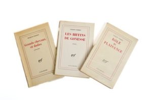 Jacques PERRET. 3 ouvrages in-8 ou in-12, brochés, en édition originale. Ensemble comprenant : - Les Biffins de Gonesse. Paris, NRF, 1961. 1/240 vélin pur fil (n° 223), celui-ci signé par l'auteur. - Grands chevaux et dadas. Souvenirs. Paris, Gallimard, 1975. 1/35 vélin Lafuma-Navarre. - Rôle de plaisance. Paris, Gallimard, 1957. 1/130 vélin Lafuma-Navarre.