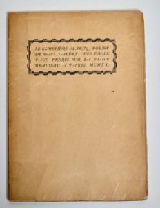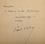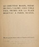 Paul VALÉRY. Le Cimetière marin. Paris, Émile-Paul, 1920. In-8, broché. Karaïskakis, 20 /// (8f.). Édition originale. Tirage limité à 556 exemplaires, celui-ci un des 500 sur Mittineague-mill (n° 75). Ex-dono de Paul Valéry sur une garde : Exemplaire de Madame Esther Alphandéry / avec les hommages de / l'auteur.