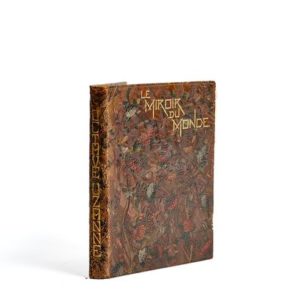 [AVRIL]. Octave UZANNE. Le Miroir du monde. Notes et sensations de la vie pittoresque. Paris, Quantin, 1888. In-4, broché, chemise de cuir estampé d'un grand décor floral peint, doublure de soie brochée. Vicaire, VII-926 /// (2f.)-IV-163-(2f.) Très nombreuses illustrations en noir, en bistre ou en couleurs dans le texte de Paul Avril. Très belle chemise en cuir estampé avec quelques épidermures sur le dos.
