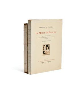 [BECQUE]. François BÉROLADE de VERVILLE. Le Moyen de Parvenir. Genève, Aux dépens de quelques amateurs, 1921. In-4, broché. Monod, I-1457 /// (2f.)-167-(1f.) Frontispice, 25 planches hors texte en couleurs et 78 bandeaux, lettrines, culs-de-lampe et vignettes en deux tons, certains répétés, par Maurice de Becque sous le pseudonyme de Maurice d'Attys. Tirage limité à 330 exemplaires, celui-ci un des 249 sur papier vélin teinté de Rives (n° 130). On joint : [WÉLY]. Camille MAUCLAIR. Âmes Bretonnes. Trois contes illustrés. Paris, Piazza, 1907. In-8, broché, étui. Illustrations en couleurs dans le texte de Wély. 1/200 vélin (n° 201).