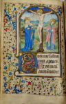 - Une grande peinture sur 5 (f.15v) représentant la Crucifixion avec enluminures, filets à l’or et grande initiale fleurie à l’encre bleue et rose avec fleurettes peintes et filigranes blancs, encadrement à décor floral avec fleurs ou fruits rouges, verts et bleus, feuilles d’acanthe bleues et or et petites feuilles à l’or.