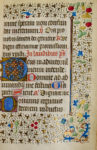 - 9 feuillets avec enluminures en encadrement (ff.31r, 45r, 51r, 55v, 59v, 64r, 71v, 166v et 173r) comportant chacun une grande initiale en bleu et rose filigranée de blanc sur fond d’or avec rinceaux et fleurettes bleus et roses, les enluminures à décor floral avec fleurs ou fruits roses, verts, rouges, et feuilles à l’or, feuilles d’acanthe bleues et or.