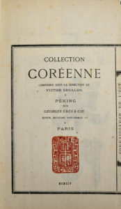 Troisième édition, en partie originale, reproduisant le texte de la seconde édition de 1907, publiée dans la Collection coréenne, composée sous la direction de Victor Segalen, à Pékin. Impression noire sur doubles pages pliées avec lettrines en rouge et noir.