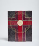 croix centrale de maroquin bordeaux avec pièces de maroquin violet et noir sur les côtés, toutes ces pièces se rejoignant sur le dos lisse, sur le premier plat, au centre de la croix, pièce ronde de maroquin crème symbolisant une hostie ponctuée de points dorés, celle-ci entourée de points dorés et d’un large cercle symbolisant une auréole, doublure de maroquin rouge sang avec au milieu un large cercle formé de points dorés et au palladium, gardes de soie cardinal, doubles gardes, tranches dorées sur témoins, couverture et dos, chemise demi-maroquin à recouvrements, étui (Paul Bonet).