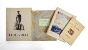 – Maurice LARROUY. Le Révolté. Paris, Kieffer, 1929. In-4, broché. 81 aquarelles en couleurs de Charles Fouqueray. 1/300 vélin (n° 31). Minimes brunissures le long d’un plat.