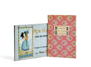 Mon village. Ceux qui ne l’oublient pas. Paris, Floury, s.d. (1913 ?). In-4 à l’italienne, percaline de l’éditeur bleu myosotis avec fleurettes et alsacienne en pied sur le premier plat et nature morte sur le second, tranches rouges (Engel). Édition originale ornée à chaque page d’illustrations en couleurs de Hansi, la plupart à pleine page.