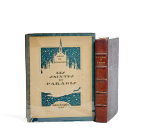 Remy de GOURMONT. Les Saintes du Paradis. Paris, René Kieffer, 1922. In-4, broché. Texte entièrement illustré de 12 pleines pages et de vignettes et encadrements d’Auguste Henri Thomas, mis en couleurs par Charpentier. 1/500 vélin de cuve (n° 258). Dos réparé avec manques.