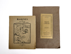 Guy LAVAUD. Marines. Paris, Le Divan, 1922. In-4, broché. Édition originale illustrée de grands bois dans le texte d’André Lhote. 1/275 Arches (n° 201), ici contenant 2 gravures sur bois aquarellées. Couverture un peu brunie, réparée.