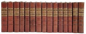 Maroquin rouge janséniste, dos à nerfs, roulette dorée sur les chasses, tranches dorées (reliure de l’époque). La plus jolie et la plus complète des éditions collectives anciennes de Brantôme, avec les remarques historiques et critiques de Le Duchet, Lancelot et R. Marchand. Elle est illustrée d’une vignette de titre aux armes de l’auteur, répétée dans chaque volume, de 14 frontispices dessinés et gravés par J. V. Schley et d’un portrait de l’auteur gravé par le même. On trouve également 8 tableaux généalogiques dont un dans le texte et 7 (sur 8) hors texte dépliants. Très bel exemplaire en plein maroquin rouge de l’époque, condition très rare, enrichi d’un second portrait de l’auteur gravé par Pinssio placé avant les Vies des dames illustres dans le premier volume. Petit manque à 3 coiffes, craquelure sans gravité à trois charnières. Les deux derniers volumes ont une reliure légèrement différente. Traces de mouillures à quelques feuillets dans les volumes II, VI et X, quelques rousseurs éparses. Il manque le premier tableau dépliant ; les exemplaires avec une lacune d’un ou plusieurs tableaux sont courants. Provenance : C. B. Caldwell, avec ex-libris.