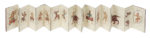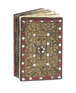 Manoscritto birmano di tipo parabaik a leporello su carta di gelso (saa) in legatura rigida, composto di 16 ripiegature a foglio illustrate ed estese su una o due unità per un totale di 30 miniature acquerellate, ognuna delle quali circondata da un singolo rigo circolare di testo birmano ad inchiostro nero. Questo manoscritto proviene con tutta probabilità dalla Birmania nordorientale (territorio dello Stato Shan) e risulta databile all'inizio del XX° secolo. Misura della legatura (e del foglio): mm. 165 x 105; del leporello esteso: mm. 1670 x 165. Bella legatura dai piatti esterni lavorati a sbalzo e decorati a racemi arabescati e intarsi riflettenti su entrambi i piatti. Ottime condizioni di conservazione. (1) Le miniature mostrano figure umane e animali in pose stilizzate, sovente nell'atto di brandire armi, occasionalmente schemi (simili ai cosiddetti "quadrati magici") consistenti in rettangoli scompartiti con segni alfabetici iscritti in funzione magico-protettive. Tali immagini illustrano i modelli di alcune diffuse tipologie di tatuaggio tribale Shan, che ricoprirebbero appunto tale funzione di profilassi attiva a difesa di eventuali nemici o malintenzionati. L'importanza e la diffusione dei tatuaggi magici di protezione presso il popolo Shan è ben nota e documentata per tutti gli strati sociali, non escluse le donne (come testimonia una delle illustrazioni), così come le profonde influenze che sulla spiritualità di questo popolo tuttora esercita l'antico Buddhismo Theravada.
