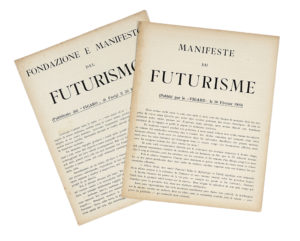 In-4° (mm 290x230). Carte [2]. Un piccolo strappo e una lieve brunitura al margine interno delle due carte, ma nel complesso buona copia. SI AGGIUNGE: Id., Fondazione e manifesto del Futurismo. (Pubblicato dal 'Figaro' di Parigi il 20 Febbraio 1909). Milano: Direzione del Movimento Futurista, s.d. [i.e. novembre/dicembre 1911]. (2) Entrambe le edizioni di questo manifesto qui presentate, le prime pubblicate con la dicitura Direzione del Movimento Futurista nella versione francese e italiana, vengono generalmente datate 1909: in realtà si tratta di ristampe successive al trasferimento di Marinetti da Via Senato 2 a Corso Venezia 61, nuova sede milanese del Movimento Futurista. L'edizione francese presenta, inoltre, un errore di stampa nel titolo: Pubblié anziché Publié.