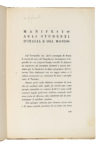 In-4° (mm 245x172). Pagine XXIII, [1], 87, [1]. Forellini senza perdite, altrimenti ottimo copia. Annotazioni a matita nel testo. Brossura editoriale con titoli in blu e nero al piatto anteriore e al dorso, con pecetta "Delia" applicata al piatto. Fioriture marginali, ma nel complesso ottima conservazione. SI AGGIUNGE: Marinetti Filippo Tommaso, Futurismo e Fascismo. Foligno: Campitelli, 1924. In-8° (mm 195x149). Esemplare intonso. Brossura editoriale con titoli in rosso e nero al piatto anteriore; leggermente staccata la parte anteriore interna, ma nel complesso ottima conservazione. SI AGGIUNGE: Id., Arte fascista. Elementi per la battaglia artistica. Torino: Edizioni Sindacati Artistici, s.d. [i.e. 1927]. In-8° (mm 200x135). Brossura editoriale con titoli in nero entro cornice tipografica rossa. Ampia gora, una piccola mancanza alla cuffia, strappetti alle cerniere e all'unghiatura di entrambi i piatti, che si conserva comunque ampia. (3) II OPERA: Raccolta di scritti e discorsi futuristi che si rifanno ad alcuni manifesti futuristi, in particolare Guerra sola igiene del mondo e Democrazia futurista. II OPERA: Prima edizione di questa raccolta di scritti programmatici e militanti, curata dal gruppo torinese.