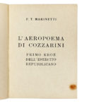 In-8° (mm 187x165). Pagine 249, [7]. Copia parzialmente intonsa e ben conservata, con lievi e diffuse fioriture e alcune leggere e uniformi arrossature concentrate principalmente alle ultime pagine. Brossura editoriale con titoli in blu al piatto anteriore e al dorso, con marchio "Poesia Rassegna Internazionale" al piatto posteriore. Leggere fioriture e qualche segno del tempo alle cerniere e al dorso, ma nel complesso buona conservazione. Con la dedica autografa di Buzzi a Cosimo Giorgieri Contri, poeta, scrittore e drammaturgo italiano, alla prima carta bianca. SI AGGIUNGE: Marinetti Filippo Tommaso, L'aeropoema di Cozzarini. Primo eroe dell'esercito repubblicano. S.l. [i.e. Milano]: Edizioni Erre, s.d. [i.e. 10 maggio 1944]. Brossura editoriale rossa con titoli in nero, illustrata con un disegno di Gino Boccasile. (2) I OPERA: Edizione originale, non comune, di questo esordio poetico di Paolo Buzzi, introdotto da una lunga prefazione di Marinetti, ben 24 pagine di energia pura, che si conclude con l'invocazione «Tutto il nostro sangue, a fiotti, per ricolorare le aurore ammantate della Terra! ... Sì, noi sapremo riscaldarti tra le nostre braccia fumanti, o misero Sole, decrepito e freddoloso, che tremi sulla cima del Gorisankar!». II OPERA: Prima edizione in volume, con testo precedentemente pubblicato su Orizzonte e Italia Nuova.